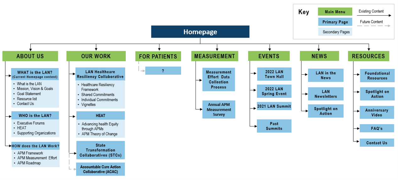 • Introduce audience-based navigation by segmenting user paths according to roles, such as payers, providers, or policymakers.